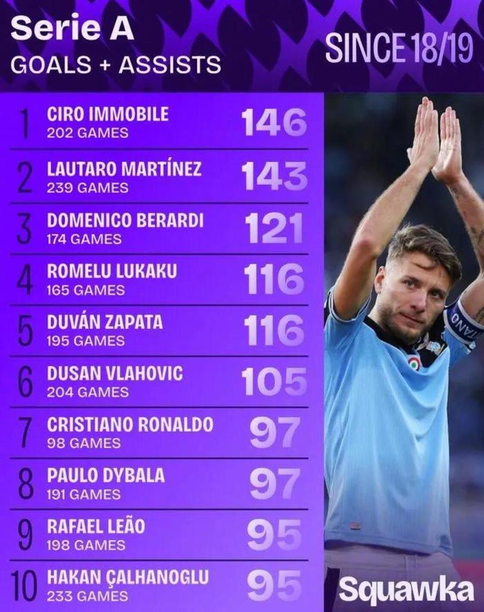 数据机构Squawka统计了自2018/19赛季劳塔罗-马丁内斯代表国际米兰出战以来,在意甲联赛直接参与进球的前十名球员。其中C罗以接近场均一次的贡献排名总榜单第7名。
